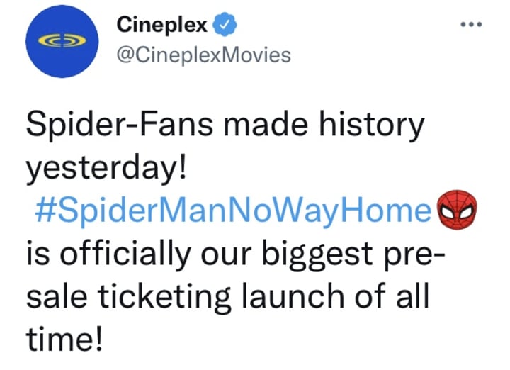. Youre Playing this Movie for the First Time. 316 members in the cineplex community. No Way Home would go live.